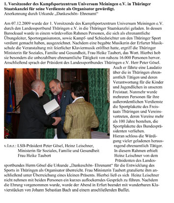 1. Vorsitzender des Kampfsportzentrum Universum Meiningen e.V. in Thüringer Staatskanzlei für seine Verdienste als Organisator gewürdigt.