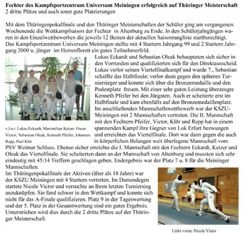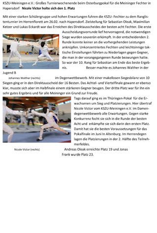 KSZU-Meiningen e.V.: Großes Turnierwochenende beim Osterburgpokal für die Meininger Fechter in Hapersdorf Nicole Victor holte sich den 1. Platz