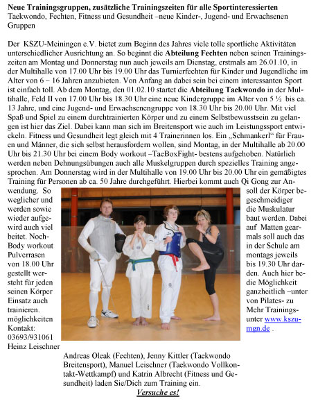 Neue Trainingsgruppen, zusaetzliche Trainingszeiten für alle Sportinteressierten Taekwondo, Fechten, Fitness und Gesundheit –neue Kinder-, Jugend- und Erwachsenen Gruppen