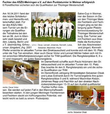 Fechter des KSZU-Meiningen e.V. auf dem Punkteturnier in Weimar erfolgreich